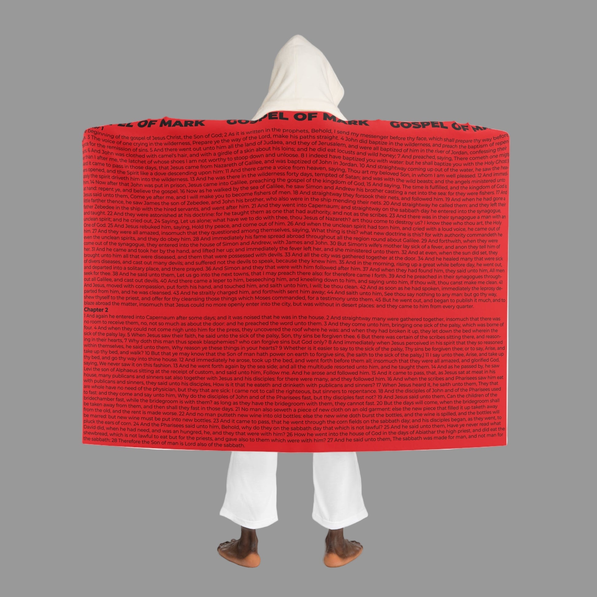 Wrap yourself in the urgency and power of the Gospel of Mark with this bold Scarlet Hooded Sherpa Blanket. This design includes beginning Chapters, capturing the beginning of Jesus’ ministry—His baptism, temptation, calling of the disciples, early miracles, and His authority over sickness and unclean spirits…