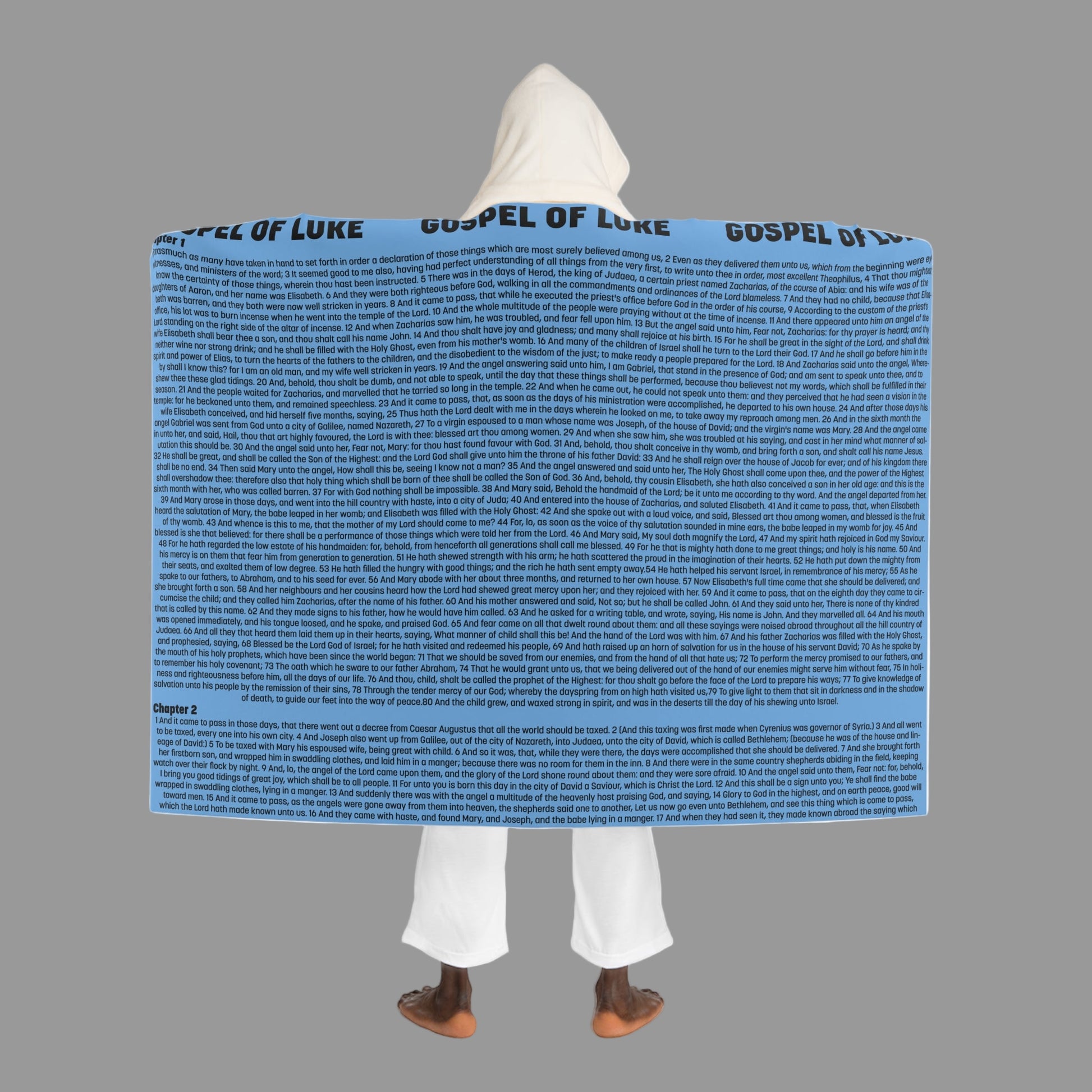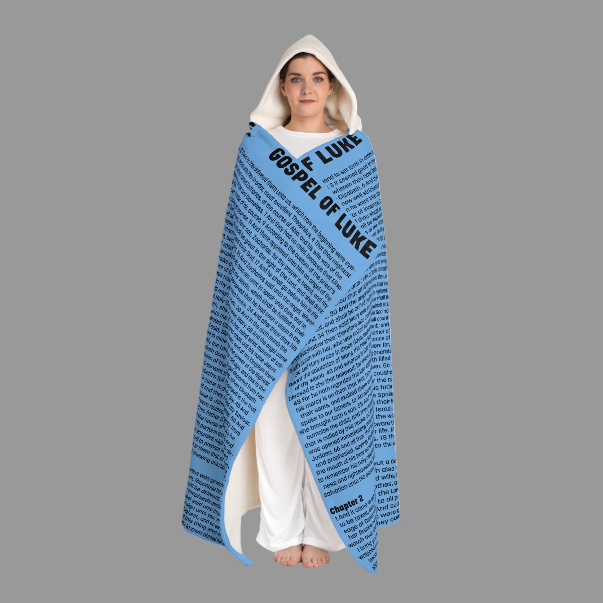 Wrap yourself in the compassion and humanity of Christ with this Luke Gospel Hooded Sherpa Blanket in peaceful Sky Blue. This design features Luke beginning Chapters, covering the angelic announcements, Mary’s visitation, Zechariah’s prophecy, and the beginning of the birth narrative of Jesus…
