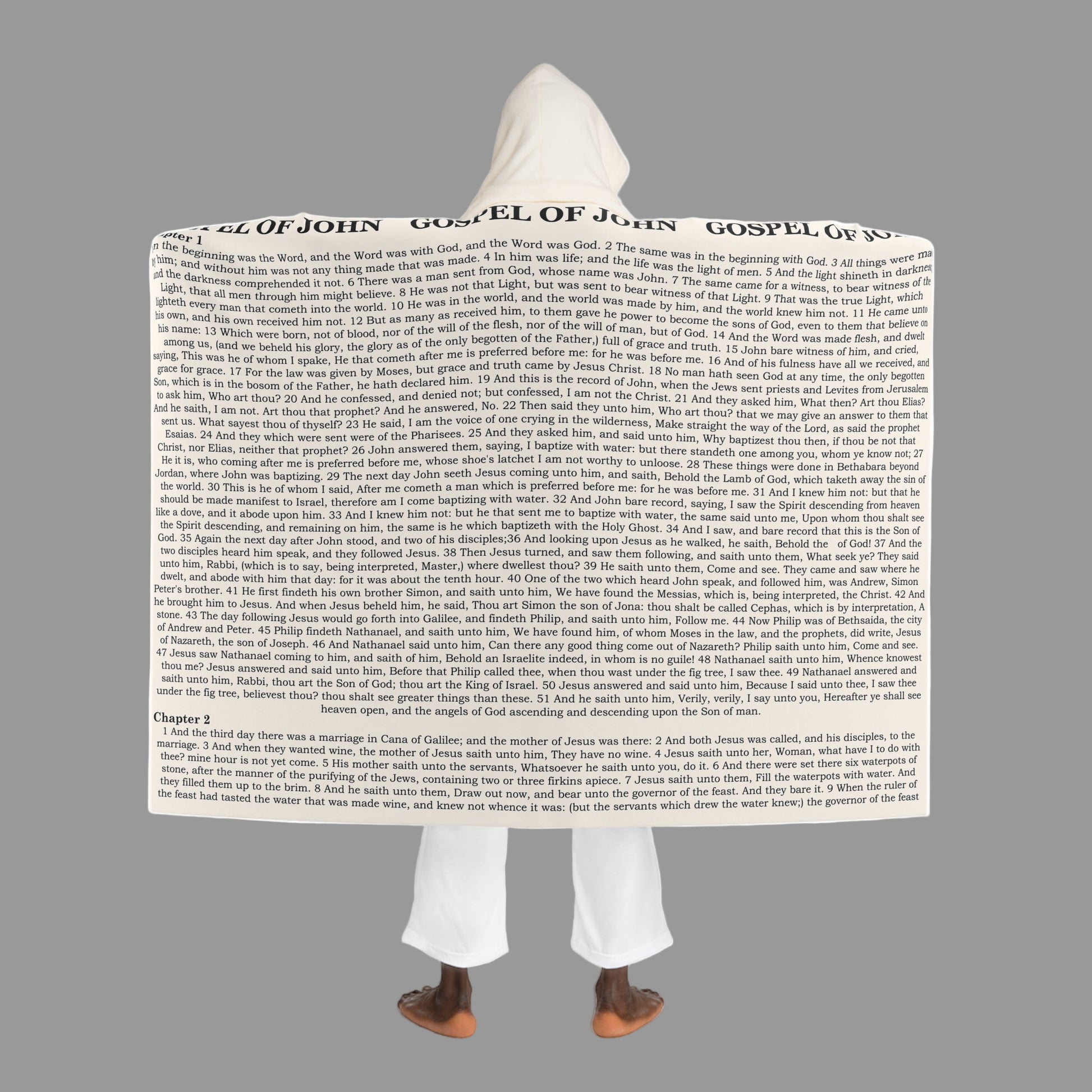 Wrap yourself in the Gospel of Light with this John Gospel Hooded Sherpa Blanket in Pure White. This design features John beginning Chapters, where Jesus is revealed as the eternal Word, the Light of the world, and the One through whom all things were made...
