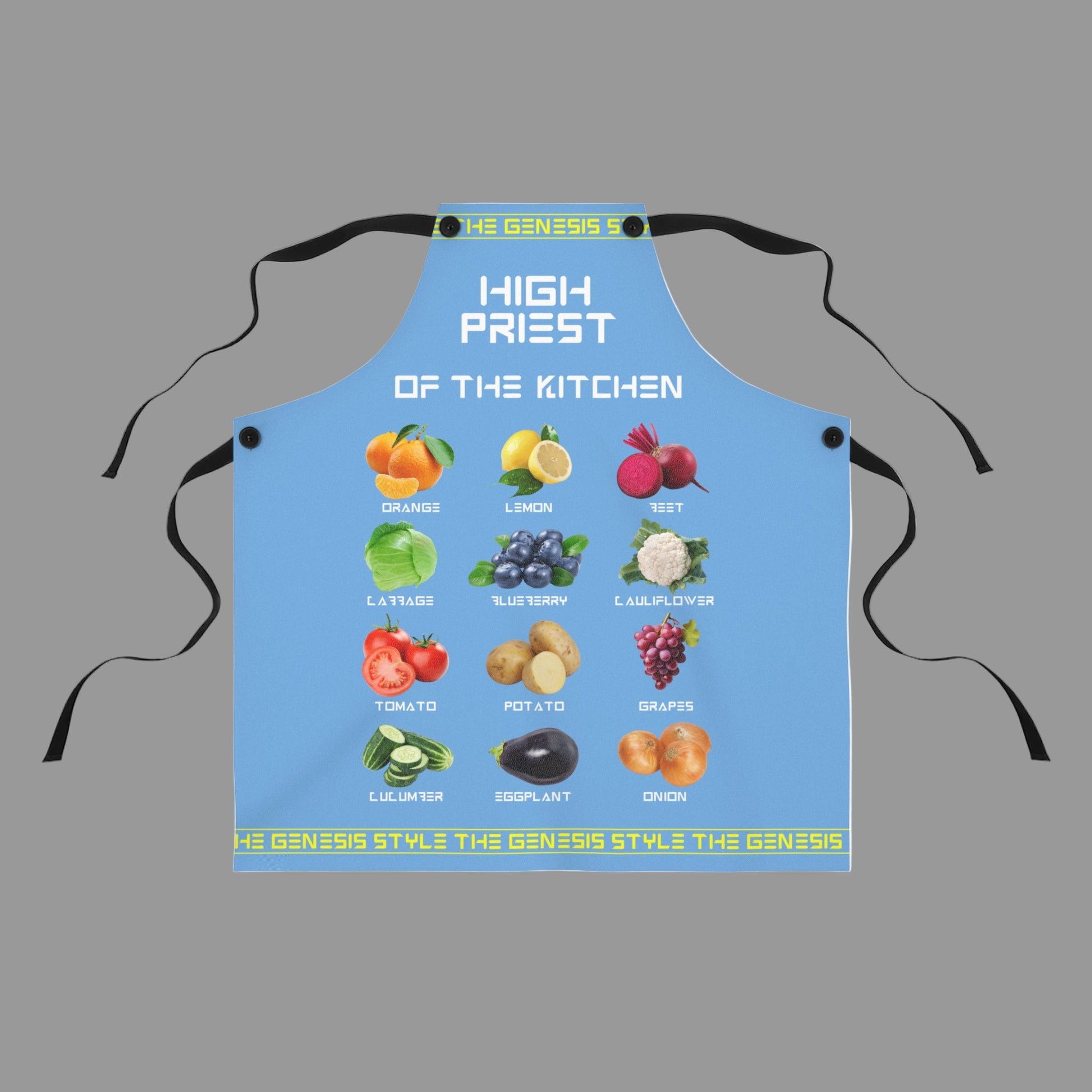Inspired by the biblical High Priest’s ephod, this apron reimagines the breastplate stones as colorful fruits and vegetables — a playful nod to the divine order of meal